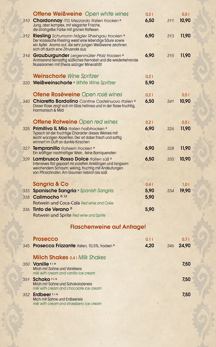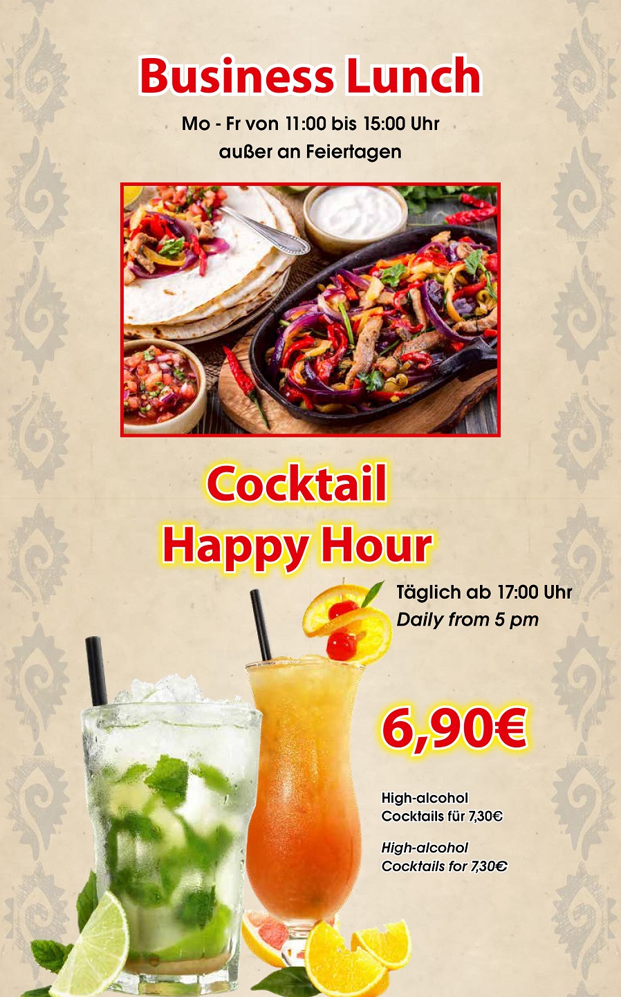 MenuUnsere Spezialitäten – Ein Fest für Ihre Sinne Mittagsmenu Täglich ab 11 – 15 Uhr(Außer an Feiertagen) Speisekarte in PDF ReservierungSollten sie eine reservierung für den heutigen tag benötigen, dann rufen sie uns bitte an.Online buchen Telefon030 36 40 86 44